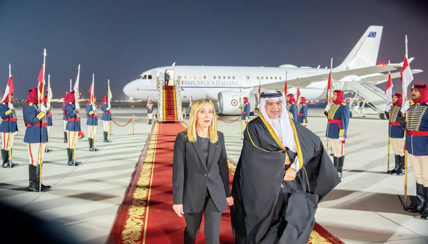 كان صاحب السمو الملكي الأمير سلمان بن حمد آل خليفة ولي العهد رئيس مجلس الوزراء في مقدمة مستقبلي دولة السيدة جورجيا ميلوني رئيسة وزراء الجمهورية الإيطالية الصديقة، لدى وصولها إلى البلاد أمس، بمناسبة زيارتها لمملكة البحرين لحضور أعمال الدورة السادسة والأربعين للمجلس الأعلى لمجلس التعاون لدول الخليج العربية، التي تستضيفها مملكة البحرين، وذلك كضيفة شرف.
