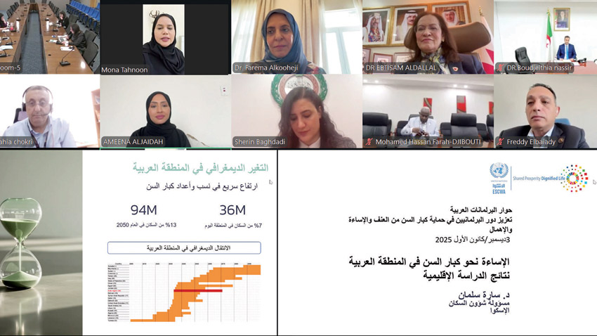 واستعرض الحوار الافتراضي خلاصة منهجية لنتائج تقرير «الإسكوا» حول التصدي لإساءة معاملة كبار السن في المنطقة العربية، وتسليط الضوء على الثغرات القانونية التي بينّها التقرير، وتحديد المجالات التشريعية ذات الأولوية لحماية كبار السن ودعم النقاش بتوصيات قابلة للتطبيق. كما تم استعراض أحدث المستجدات في التشريعات الوطنية المتعلقة بحماية كبار السن من الإساءة والعنف وتبادل الدروس المستفادة.