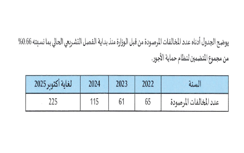 كشفت وزارة العمل ان عدد المخالفات التي رصدتها بشأن التزام صاحب العمل بسداد الأجور المستحقة للعمال في الموعد المتفق عليه، منذ بداية الفصل التشريعي الحالي في 2022 وحتى أكتوبر الماضي، بلغت 466 حالة، بما نسبته 0.66% من مجموع المنضمين إلى نظام حماية الأجور، مضيفة انه، بحسب عدد المخالفات المرصودة، فإن نسبة الالتزام بسداد الأجور بلغت 99.4%.