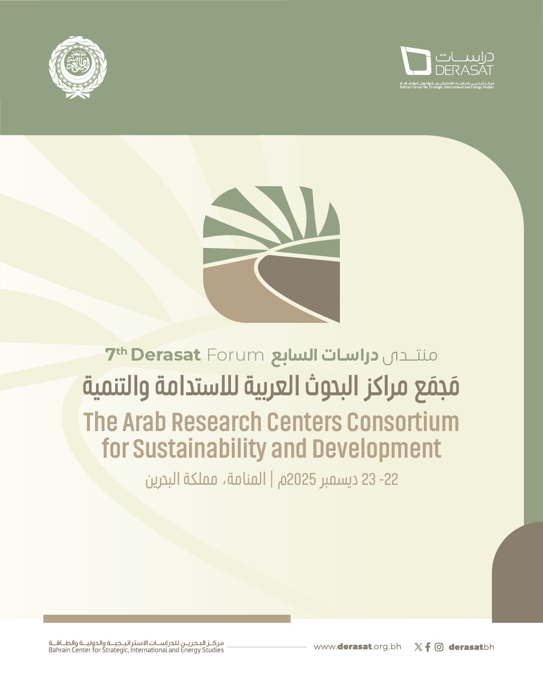 ينظّم مركز البحرين للدراسات الاستراتيجية والدولية والطاقة (دراسات) منتداه السابع تحت عنوان (مَجْمَع مراكز البحوث العربية للاستدامة والتنمية)، بالشراكة مع الأمانة العامة لجامعة الدول العربية، يومي 22 و23 ديسمبر الجاري، بمشاركة نخبة من المتحدثين الرواد من أبرز مراكز الدراسات والبحوث في الوطن العربي.