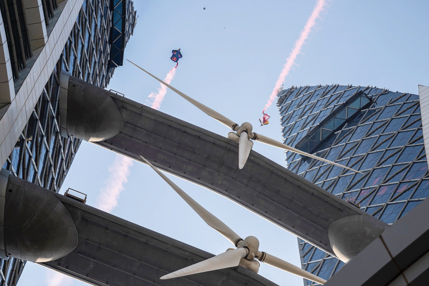 وانطلق الرياضيان من طائرة هليكوبتر من طراز بلاك هوك على ارتفاع 4,000 قدم، حيث تسارعا فوق أفق المنامة قبل أن ينفصلا إلى مسارين متعاكسين، ثم يعودا للدخول بدقة نحو خط المنتصف بين البرجين على ارتفاع 40 مترًا فوق مراوح التوربينات الهوائية الشهيرة للمبنى.