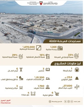 وبينت الوزيرة الرميحي أن المرحلة الثالثة بمشروع مدينة سترة الإسكانية تنفذها الوزارة بالتعاون مع شركة "سي إم إي سي" الصينية، ويتكون المشروع، بالإضافة إلى 1269 وحدة سكنية، من تنفيذ خدمات البنية التحتية، والتي تشمل الطرق الرئيسة والفرعية، وشبكات الصرف الصحي، وتصريف مياه الأمطار، والإنارة، منوهة بأن المرحلة الثالثة تُعدّ أكبر مرحلة في المشروع على مساحة إجمالية تبلغ 670 ألف متر مربع.