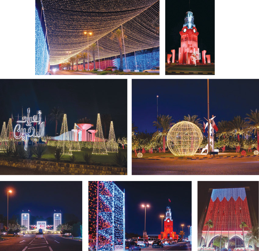 ازدانت شوارع مملكة البحرين وطرقاتها ومبانيها ومعالمها الرئيسية باللونين الأبيض والأحمر، بمناسبة احتفال مملكة البحرين بأعيادها الوطنية، وعيد الجلوس السادس والعشرين لحضرة صاحب الجلالة الملك حمد بن عيسى آل خليفة ملك البلاد المعظم حفظه الله ورعاه، وما يصاحبها من مناسبات وطنية. وتنوعت أشكال الزينة، التي غطت عديدا من المباني والأبراج الضخمة والمجمعات التجارية والمؤسسات الحكومية والخاصة في محافظات المملكة، لتشمل صور حضرة صاحب الجلالة الملك المعظم حفظه الله ورعاه، وصاحب السمو الملكي الأمير سلمان بن حمد آل خليفة ولي العهد رئيس مجلس الوزراء حفظه الله، ومقتطفات من الكلمات السامية لجلالة الملك المعظم في مختلف المناسبات الوطنية، والتي توثق مدى اعتزاز جلالته أيده الله بعطاءات شعب مملكة البحرين، وتؤكد ما يوليه جلالته حفظه الله ورعاه من حرص واهتمام بتطور واستدامة مسيرة التنمية التي يشهدها الوطن في ظل قيادة جلالته الحكيمة. كما حرصت المحافظات والبلديات على إقامة وتركيب الأنوار المضيئة والصور واللوحات التي تعبر عن مكانة الأعياد الوطنية وأهميتها في ترسيخ قيم الولاء والانتماء للوطن العزيز، لترسم هذه الأنوار والإضاءة في التقاطعات والميادين وعلى الأشجار والنخيل لوحات فنية مبهرة، إلى جانب عديد من اللوحات التي تحمل عبارات التهاني والتبريكات بهذه المناسبة الوطنية، وتتضمن شعارات وكلمات تجسد القيم الوطنية والهوية والانتماء الأصيل للوطن. وتميزت مظاهر الزينة في مختلف أنحاء الوطن بأنها تعبير عن قيمة الأعياد الوطنية ودلالاتها الوطنية، وقد تم اعتماد أحدث تقنيات الإنارة في إقامتها، بما أضفى عليها شكلًا خلابًا ولمحات جمالية.