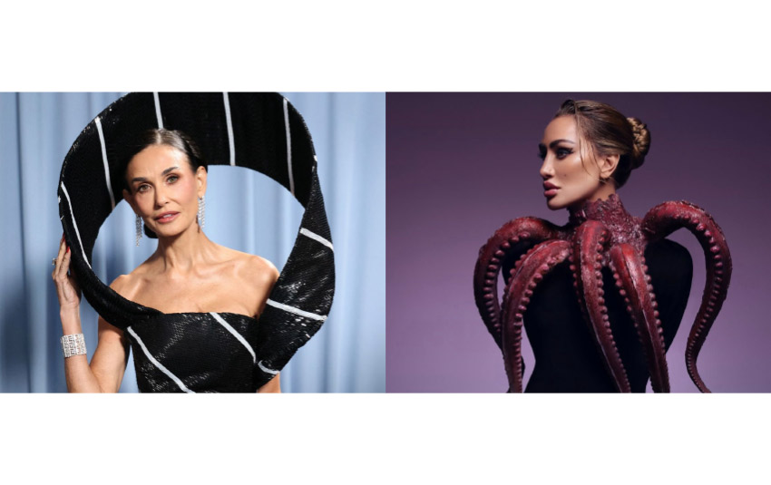 البداية كانت مع ديمي مور صحيح أنّ ديمي مور بعيدة عادةً عن الإطلالات الغريبة، لكن في حفل ميت غالا 2025 قرّرت خوض هذه التجربة. فقد أطلت بفستان أسود وأبيض منحوت من Thom Browne، صُمّم ليبدو كربطة عنق ضخمة تغطي الجسم بالكامل.