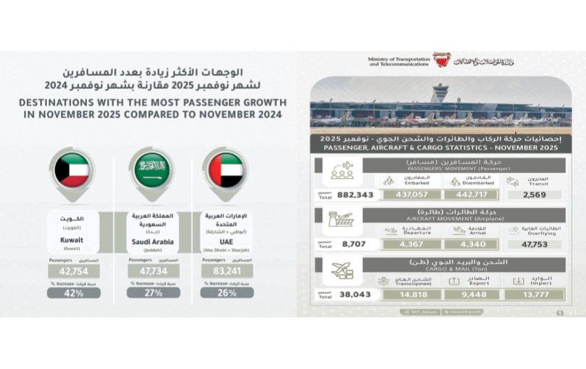 أظهرت إحصائيات وزارة المواصلات والاتصالات أن حركة الركاب والطائرات والشحن الجوي عبر مطار البحرين الدولي واصلت تسجيل مؤشرات إيجابية خلال شهر نوفمبر 2025، بما يعكس تنامي الطلب على خدمات النقل الجوي وتعزيز مكانة المملكة كمحور إقليمي للطيران.