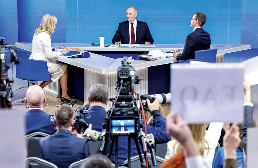 موسكو - (أ ف ب): أكّد الرئيس الروسي فلاديمير بوتين أمس الجمعة أن الكرة في ملعب أوكرانيا والغرب في المفاوضات الرامية إلى إنهاء الحرب، مع الإشادة بالتقدّم الذي حققته قواته على الجبهة، خلال مؤتمره الصحفي السنوي. ومع حلول شتاء جديد، أكد بوتين للروس على مدى أيام أن موسكو ستنتزع باقي مناطق شرق أوكرانيا بالقوّة في حال فشل الجهود الدبلوماسية. وصرّح بوتين البالغ من العمر 73 عاما بمناسبة خطابه التقليدي في نهاية العام والذي يُنقل مباشرة أن «الكرة هي بالكامل في ملعب خصومنا الغربيين، قادة النظام في كييف والجهات الأوروبية الراعية لهم في المقام الأول»، مؤكدا أن موسكو مستعدة «للتفاوض وإنهاء النزاع بسبل سلمية».