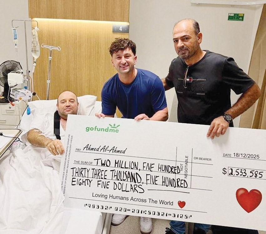 حصل رجل ينسب إليه الفضل في إنقاذ أرواح لانتزاعه سلاحا من أحد المهاجمين المشتبه فيهم خلال إطلاق نار على شاطئ بونداي الأسترالي على شيك تتجاوز قيمته 2.5 مليون دولار أسترالي (1.65 مليون دولار أمريكي) أمس الجمعة، بعد حملة تبرعات ضخمة شارك فيها عشرات الآلاف عبر الإنترنت.
