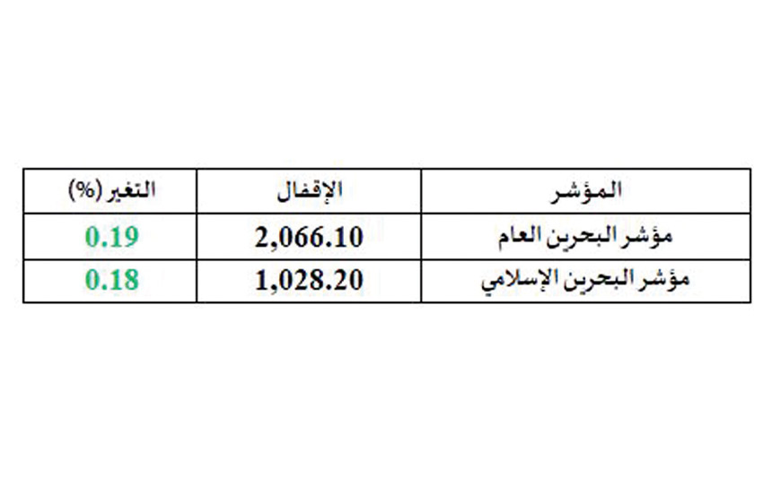 أقفل «مؤشر البحرين العام» يوم أمس الثلاثاء عند مستوى 2,066.10 بارتفاع قدره 3.93 نقاط مقارنة بإقفاله يوم الإثنين، في حين أقفل «مؤشر البحريـن الإسلامـي» عند مستوى 1,028.20 بارتفاع قدره 1.81 نقطة مقارنة بإقفاله السابق.