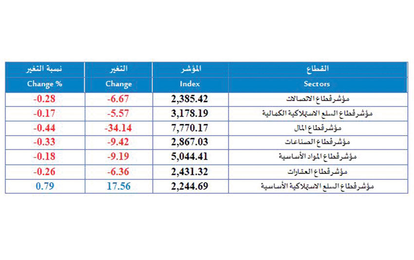 وفيما يخص المؤشرات القطاعية، فالجدول يوضح أداء المؤشرات لقطاعات البورصة والتغير ونسبة التغير مقارنة بأدائها الأسبوع الماضي.