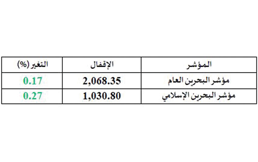 أقفل «مؤشر البحرين العام» يوم أمس الأحد عند مستوى 2,068.35نقطة بارتفاع قدره 3.45 نقطة مقارنة بإقفاله يوم الخميس الماضي، في حين أقفل «مؤشر البحرين الإسلامي» عند مستوى 1,030.80 نقطة بارتفاع قدره 2.82 نقطة مقارنة بإقفاله السابق.