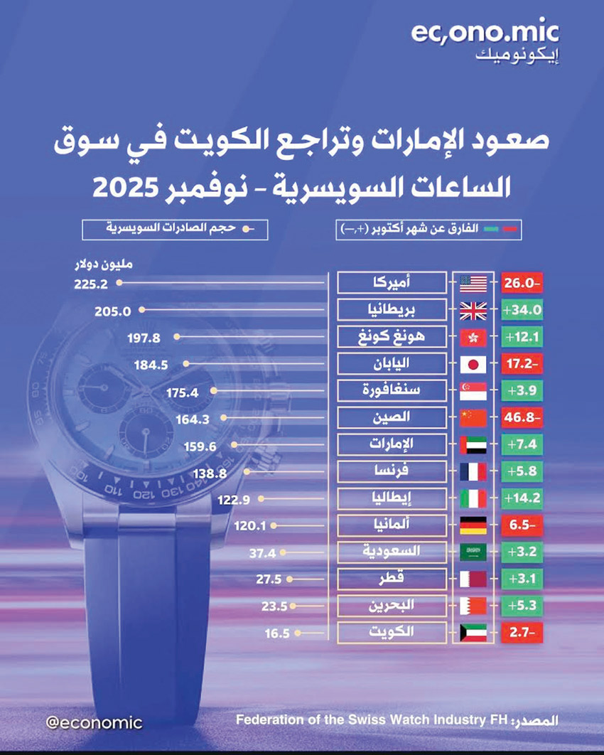 وعلى الصعيد الإقليمي، أظهرت البيانات تسجيل دولة الإمارات العربية المتحدة نموًا في واردات الساعات السويسرية خلال نوفمبر، لتواصل تصدرها كأكبر سوق عربي في هذا القطاع، فيما حافظت أسواق خليجية أخرى، من بينها السعودية وقطر، على مستويات مستقرة مع مكاسب طفيفة مقارنة بالشهر السابق.