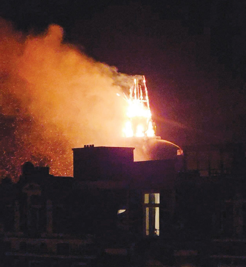 وبدأت النيران بعد منتصف الليل مباشرة، مما أدى إلى انهيار برج كنيسة فوندل التي يعود تاريخ بنائها إلى عام 1872.
