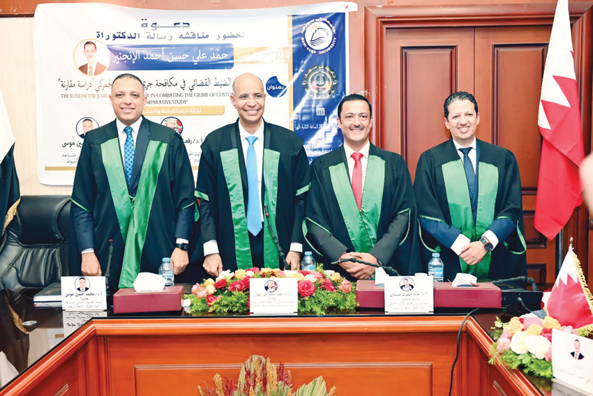 وحملت الأطروحة عنوان «دور مأموري الضبط القضائي في مكافحة جريمة التهرب الجمركي، من خلال دراسة مقارنة بين النظامين القانونيين في جمهورية مصر العربية ومملكة البحرين».