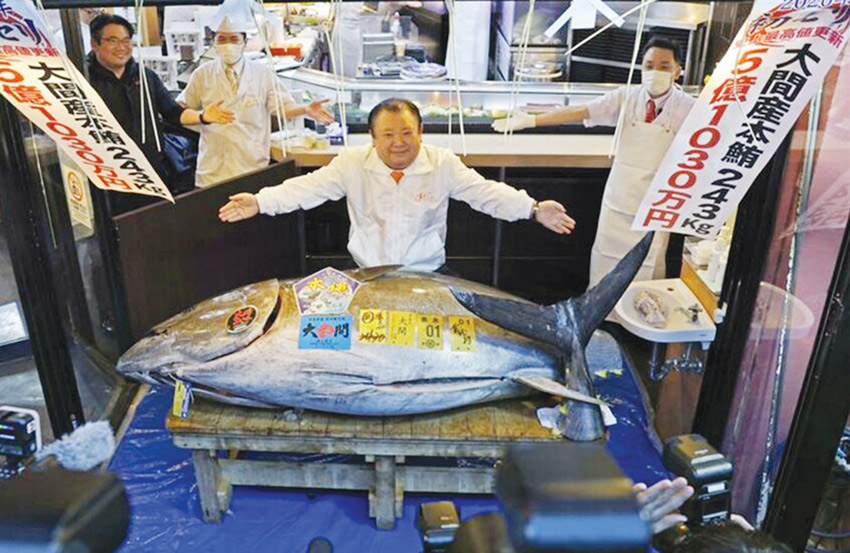 دفع مالك سلسلة مطاعم سوشي مبلغا قياسيا قدره 3,27 ملايين دولار (510,3 ملايين ين) مقابل سمكة تونة زرقاء عملاقة طُرحت في مزاد رأس السنة المرموق الذي أقيم أمس في سوق السمك الرئيسية في طوكيو.
