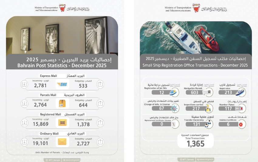 واصلت وزارة المواصلات والاتصالات تسجيل مؤشرات تشغيلية لافتة خلال شهر ديسمبر 2025، عاكسةً حجم النشاط المتنامي في قطاعات تسجيل السفن الصغيرة والخدمات البريدية في مملكة البحرين، وفق الإحصاءات الرسمية الصادرة عن الوزارة.