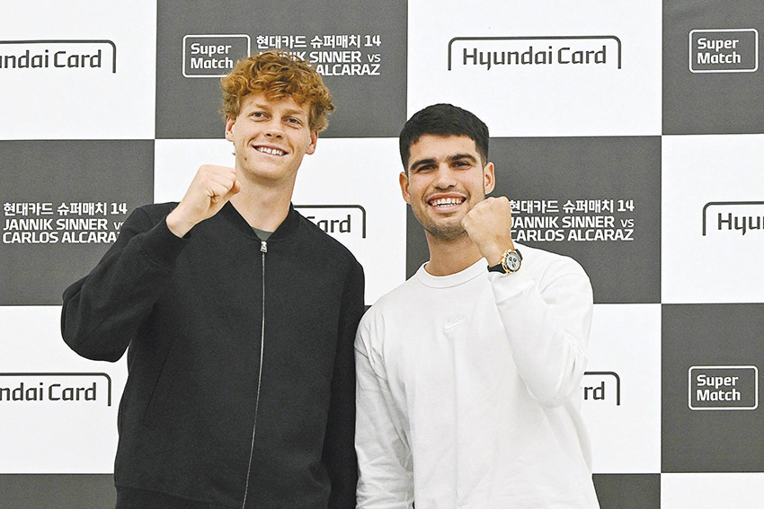 سيول - (أ ف ب): أعلن المصنفان الأول والثاني عالميا الإسباني كارلوس ألكاراس والإيطالي يانيك سينر أمس الجمعة، استعدادهما للعب معا في مباراة للزوجي لكرة المضرب في المستقبل، ووعد الأخير بمناقشة الأمر مجددا «هذا العام أو العام المقبل» مع منافسه الإسباني. وعقد النجمان البارزان في عالم الكرة الصفراء عشية مباراة استعراضية بينهما في سيول، أول مؤتمر صحفي مشترك لهما هذا الموسم. وعند سؤالهما عن إمكانية تشكيل ثنائي لخوض منافسات الزوجي في المستقبل، لم يستبعد الفائزان بآخر ثماني بطولات غراند سلام في الفردي هذا الاحتمال.