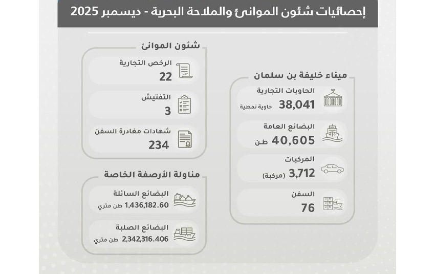 وبحسب الإحصائيات، بلغ عدد الحاويات التجارية التي تم تداولها في ميناء خليفة بن سلمان نحو 38,041 حاوية نمطية، في حين وصلت كميات البضائع العامة إلى 40,605 أطنان، إلى جانب مناولة 3,712 مركبة، واستقبال 76 سفينة خلال الشهر ذاته.