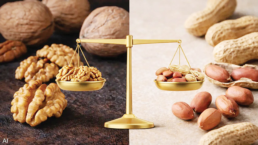 يحتوي الجوز على نحو ضعف كمية الدهون الأحادية غير المشبعة مقارنة بالفول السوداني، كما يتميّز بتركيز أعلى من مضادات الأكسدة الواقية للقلب. ومع ذلك، تبقى المكسرات عموما عالية السعرات الحرارية، ما يستدعي الاعتدال في استهلاكها. وتوصي جمعية القلب الأمريكية بتناول نحو 30 غراما يوميا من المكسرات لتحقيق الفائدة الصحية من دون تجاوز الاحتياجات اليومية من السعرات.