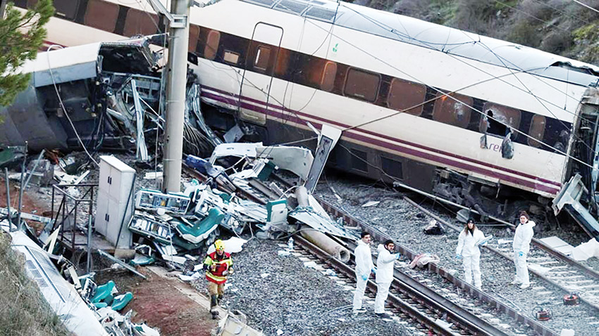 ارتفعت حصيلة اصطدام قطارين فائقي السرعة مساء الأحد في جنوب إسبانيا إلى ما لا يقل عن 39 قتيلا، وفق حصيلة جديدة ولكن «غير نهائية» أعلنتها السلطات صباح أمس الاثنين، واصفة الحادثة بأنها «بالغة الغرابة». وكانت الحصيلة السابقة 21 قتيلا، إلا أنها زادت بشكل كبير خلال الليل، وبلغت صباح أمس الاثنين 39 قتيلا بحسب ناطقة باسم وزارة الداخلية. وقال وزير النقل الإسباني أوسكار بوينتي إن «عدد القتلى ليس نهائيا». كما أسفر الحادث عن إصابة حوالي 123 شخصا بجروح، بينهم 5 في حالة خطرة جدا و24 في حالة خطرة، وفقا للناطقة باسم وزارة الداخلية. وأشار بوينتي إلى أن إجلاء جميع المصابين أُنجِز ليل الأحد إلى الاثنين. ونُشرت وحدة الطوارئ في الجيش الإسباني في المنطقة لمساندة فرق الإسعاف وأقيم مستشفى ميداني على مقربة من موقع الحادث.