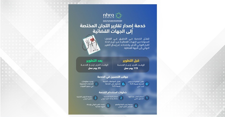 في إطار الجهود الحكومية لتطوير جودة الخدمات وإعادة هندستها، طوّرت الهيئة الوطنية لتنظيم المهن والخدمات الصحية خدمة إصدار تقارير اللجان الطبية المختصة إلى الجهات القضائية، بهدف تسهيل الإجراءات و تحديث الآليات و تسريع إنجاز الطلبات، بما ينعكس إيجابًا على تحسين تجربة المستفيدين.