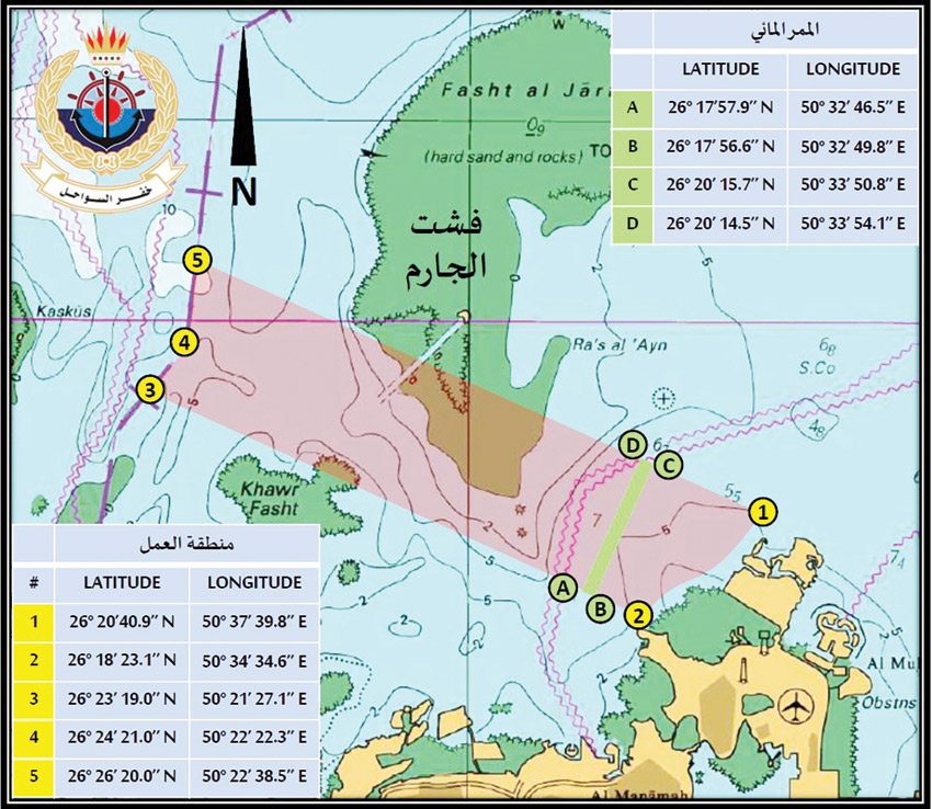 وأكدت خفر السواحل ضرورة التزام جميع مرتادي البحر وقائدي السفن والقوارب بالتعليمات والإرشادات الصادرة، والعبور من خلال الممر المائي المخصص الموضح باللون الأخضر في الخارطة، وذلك بحسب الإحداثيات المحددة، وعدم الاقتراب من منطقة العمل حفاظًا على سلامتهم وضمان انسيابية سير المشروع.