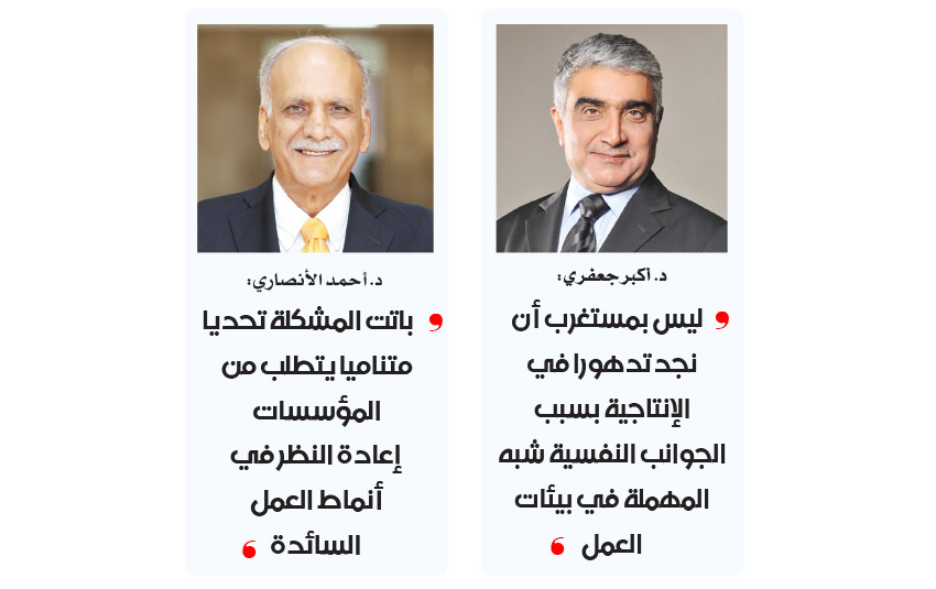 واستنادا إلى دراسات أجرتها مؤسسة جفكون لتحسين الإنتاجية على عدد ممن الشركات في البحرين، تبين أن أبرز الأولويات التي تدعم الحالة النفسية للعامل بشكل ينعكس على انتاجيته تعاني من القصور او شبه غائبة في بعض مواقع العمل، ومن ذلك إدراك القيمة الذاتية والتقدير والاحترام والعلاقات الإنسانية والوجدانية، وحسن التواصل. وبنفس الوقت هناك بيئات تتسم بنظام سيطرة مطلقة تخلق حالة من التخوف والقلق عند الموظفين. وتزداد المشكلة بوجود مدير نرجسي ميكافيلي، تتسم شخصيه بالانتهازية والسيطرة على الاخرين والتركيز على الإنتاج من دون اعتبار للجوانب الإنسانية. فيما تحولت إدارات الموارد البشرية إلى التركيز على الأدوار الإدارية التنظيمية والفنية بعيدا عن الجوانب الوجدانية الحسية. في حين ان ربحية الشركة وانتاجيتها تعتمد كما ذكرت على الحالة النفسية للموظفين.