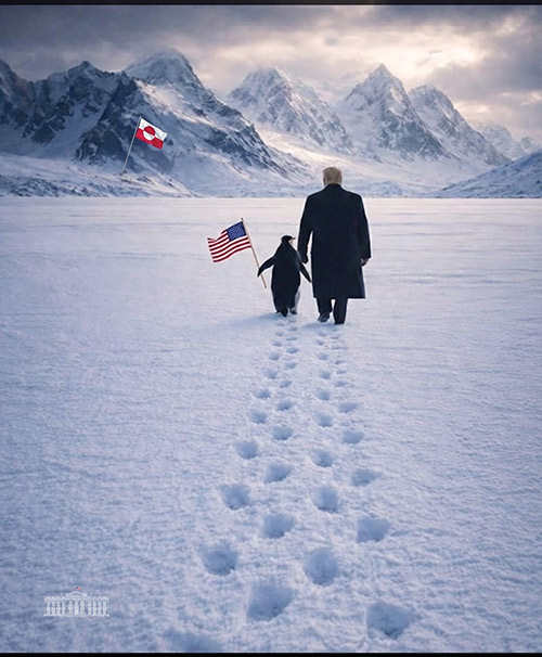نشر البيت الأبيض صورة مركبة للرئيس الأمريكي دونالد ترامب إلى جانب بطريق يحمل العلم الأمريكي في جزيرة جرينلاند، في خطوة دعائية لافتة أثارت تفاعلاً واسعاً على منصات التواصل الاجتماعي، ولا سيما أن طيور البطريق لا تعيش أساساً في المنطقة القطبية الشمالية.