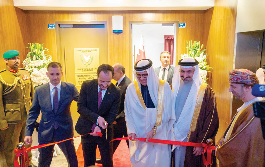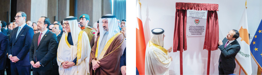في إطار الزيارة الرسمية التي قام بها فخامة الرئيس نيكوس خريستودوليدس رئيس جمهورية قبرص الصديقة لمملكة البحرين، قام فخامته أمس بافتتاح مقر السفارة القبرصية لدى المملكة، بحضور الدكتور عبداللطيف بن راشد الزياني وزير الخارجية، وعبدالله بن عادل فخرو وزير الصناعة والتجارة رئيس بعثة الشرف، والوفد المرافق لفخامة الرئيس.