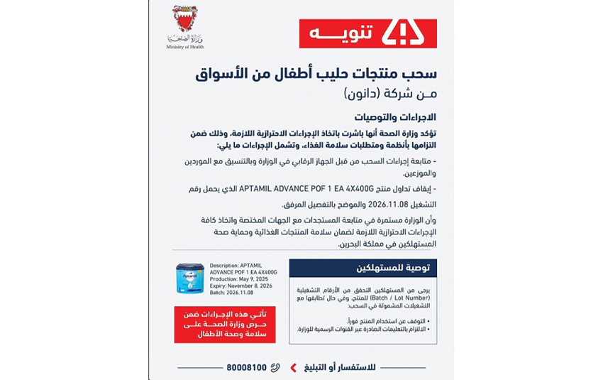 وأكدت الوزارة في حسابها الرسمي على منصة الإنستغرام أمس أنها باشرت اتخاذ الإجراءات الاحترازية اللازمة، وذلك ضمن التزامها بأنظمة ومتطلبات سلامة الغذاء، وتشمل الإجراءات: متابعة إجراءات السحب من قبل الجهاز الرقابي في الوزارة والتنسيق مع الموردين والموزعين، وإيقاف تداول منتج (Aptamil Advance POF 1 EA 4X4400G) الذي يحمل الرقم التشغيلي 08.11.2026.