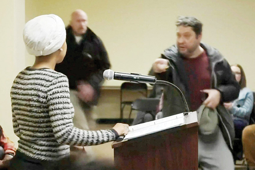 وأعلنت الشرطة اعتقال الرجل لارتكابه اعتداء من الدرجة الثالثة. وانتقدت عمر، في التصريحات التي كانت تدلي بها وقت هجوم الرجل عليها، وكالة إنفاذ قوانين الهجرة والجمارك ووزيرة الأمن الداخلي كريستي نويم، وطالبت الوزيرة بالاستقالة في أعقاب مقتل رجل وامرأة أمريكيين بالرصاص في منيابوليس في الأسابيع القليلة الماضية خلال حملة ترامب لإنفاذ قوانين الهجرة. وقالت «لا يمكن إصلاح وكالة إنفاذ قوانين الهجرة والجمارك... يجب علينا إلغاء الوكالة نهائيا، ويجب على وزيرة الأمن الداخلي كريستي نويم الاستقالة أو مواجهة المساءلة». وقوبلت تصريحاتها بتصفيق من الحاضرين. وبعد لحظات، تقدم رجل كان يجلس في صف أمامي نحوها ورش عليها مادة مما وصفته الشرطة بأنه محقن وقال لها «يجب أن تستقيلي». وتقدمت عمر بضع خطوات نحو الرجل رافعة يدها في تحد لما فعل، قبل أن تتم السيطرة عليه وواصلت حديثها بعد استراحة قصيرة، غير أن المحيطين بها حثوها على تلقي علاج طبي وقالت إنها لا تحتاج إلا لمنديل. وأصدر مكتبها بيانا في وقت لاحق يؤكد أنها بخير. وقالت شرطة منيابوليس في بيان إن خبراء الأدلة في مكان الواقعة. وقال شاهد من رويترز إن السائل رائحته مثل الأمونيا وتسبب في تهيج طفيف في الحلق. وقالت عمر للحضور بعد أن رفضت وقف الفعالية «تعلمت منذ سن صغيرة عدم الإذعان للتهديدات... تنظر إليهم وجها لوجه وتقف بشجاعة». واستهدف ترامب مرارا عمر بتوجيه الإهانات في تصريحات علنية وفي منشورات على وسائل تواصل اجتماعي، كما استهزأ بأنها جاءت من الصومال. وقال خلال اجتماع لمجلس الوزراء في ديسمبر «إلهان عمر قمامة... انها قمامة. أصدقاؤها قمامة».