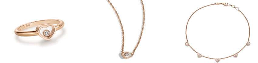 تقدم شوبارد إبداعات جديدة ضمن مجموعة مجوهرات «قلوبي السعيدة» (My Happy Hearts) تتضمن قلادات بتصاميم جديدة مصنوعة من الذهب الأخلاقي عيار 18 قيراطا، وتتضمن القلادات قلباً واحداً يحتضن ألماسة متراقصة أو 5 قلوب معلقة بسلاسل بأطوال قابلة للتعديل، لتجسد بذلك رموز الدار المميزة للتعبير عن مشاعر العطف وحب الذات.