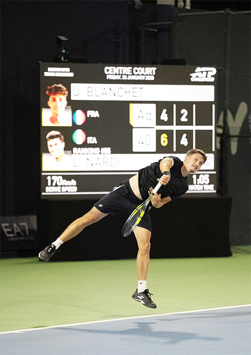 وفي آخر لقاءات نصف النهائي، أكمل اللاعب الايطالي لوكا ناردي أضلاع المربع الذهبي بعدما تفوق على اللاعب الفرنسي أوغو بلانشيه بمجموعتين من دون رد (6-4) (6-4)، في مواجهة شهدت سيطرة واضحة للاعب الإيطالي خلال مجريات اللقاء، ليسير بثبات الى نصف النهائي.