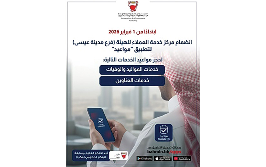 أعلنت هيئة المعلومات والحكومة الإلكترونية انضمامها الى تطبيق «مواعيد»، وتوفير خدمة حجز المواعيد لخدمات المواليد والوفيات، وخدمات عناوين المباني والمؤسسات، التي يقدمها قسم المواليد والوفيات والعناوين بمركز خدمة العملاء للهيئة – فرع مدينة عيسى، كخيار إضافي إلى جانب القنوات الرقمية الأخرى، وذلك للراغبين في الحضور الشخصي لإنجاز معاملاتهم بعد حجز مواعيدهم عبر التطبيق المتوافر على متجر تطبيقات الحكومة الإلكترونية bahrain.bh/apps ومتاجر Android وiOS وHuawei، وذلك اعتبارًا من اليوم الأحد الموافق 1 فبراير 2026.