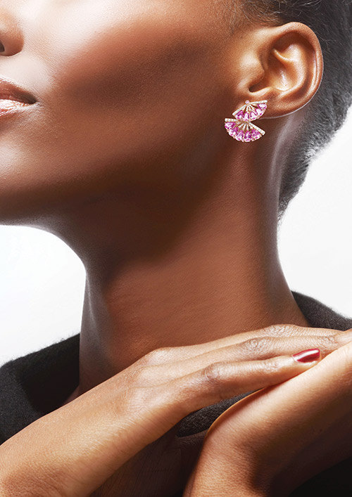تتكون الأقراط من قطعتين على شكل التنورة المنفوشة لراقصة الباليه، تميلان عن بعضهما البعض لتتقاطعان في رقصة باليه ثنائية تبعث إحساساً بالرشاقة والحرية. وقد صنعت الأقراط من الذهب الوردي عيار 18 قيراطا، ورصّعت بالسافير الوردي بقطع كمثرى وألماس برّاق بقطع بريلنت، لتتألق بتصميم يشع بحس الرشاقة والرقي. وتتطابق القلادة مع الأقراط بنفس التصميم، لتتلألأ على إيقاع رقصة من بريق الضوء، كما هو الحال في جميع إبداعات مجموعة (L’Heure du Diamant).