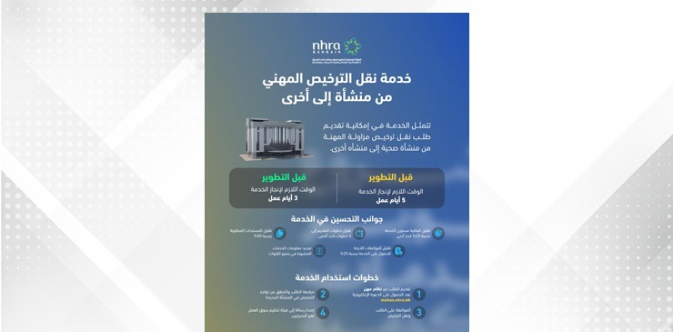 وبموجب هذه الخدمة المطورة، تم تقليص مدة إنجاز المعاملة من خمسة أيام عمل إلى ثلاثة، حيث أصبح بإمكان ممارسي المهن الصحية تقديم طلبات الانتقال للعمل في مؤسسة صحية أخرى، وتحويل ترخيص مزاولة المهنة الصحية إلكترونيًا عبر نظام (مهن). وقد جرى تطوير إجراءات التسجيل بما يسهم في تحسين سير العمل، ورفع جودة وكفاءة الخدمات.