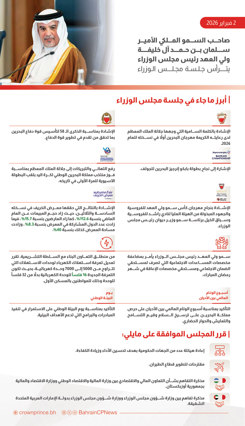 بعد ذلك أكد مجلس الوزراء حرص مملكة البحرين على ترسيخ السلام وقيم التسامح والتعايش والحوار الحضاري، وذلك بمناسبة أسبوع الوئام العالمي بين الأديان.