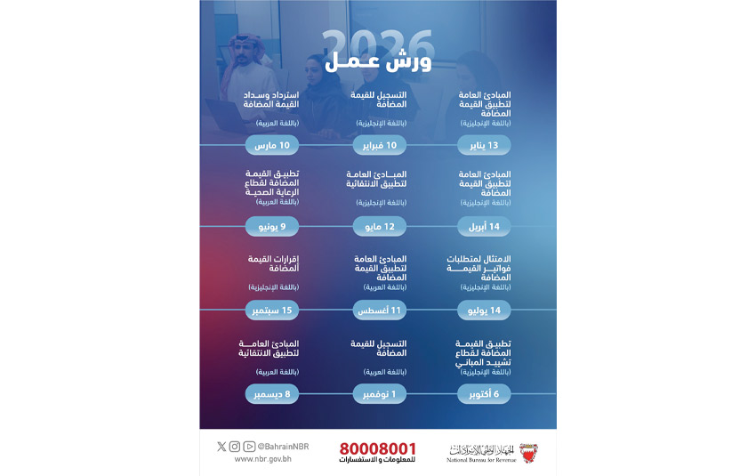 ودعا الجهاز الوطني للإيرادات جميع الراغبين في الانضمام إلى التسجيل المسبق للورش عبر الموقع الإلكتروني للجهاز (www.nbr.gov.bh/workshop_registration)، حيث سيقوم المعنيون لدى الجهاز بالتواصل وتوفير البيانات الخاصة بالورش، كما يمكن الاطلاع على آخر المستجدات من خلال منصات التواصل الاجتماعي للجهاز (@Bahrainnbr) أو التواصل مع أحد المختصين في مركز الاتصال على الرقم 80008001 لطرح أي استفسارات.