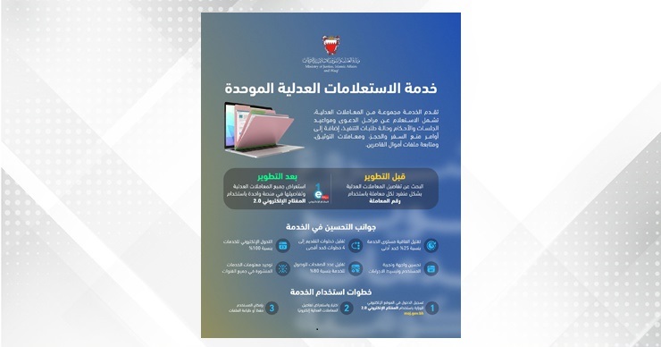وفي هذا الإطار، أكد المستشار الدكتور محمد مجبل الوكيل المساعد لقضايا الدولة والتعاون الدولي بوزارة العدل والشؤون الإسلامية والأوقاف، أن إطلاق خدمة الاستعلامات العدلية الموحدة، يأتي تجسيدًا لحرص الوزارة على تيسير الإجراءات العدلية أمام المراجعين، مشيرًا إلى أن الخدمة تمكّن المستخدمين من متابعة شؤونهم القانونية والقضائية بمرونة وعبر منصة موحدة، بما يسهم في اختصار الوقت والجهد، ورفع كفاءة الخدمات الحكومية المقدمة، ودعم سرعة الإنجاز بما يتواكب مع مسيرة التنمية الشاملة في مملكة البحرين.