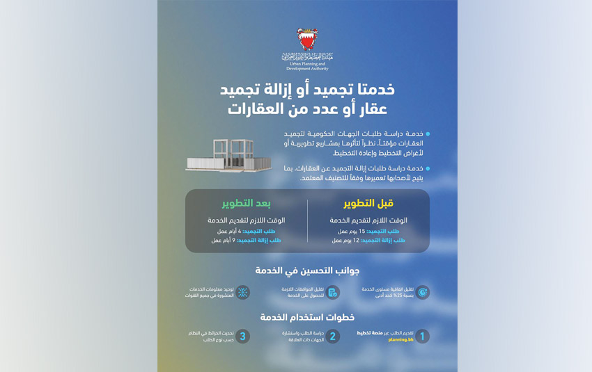 في إطار الجهود الحكومية لتطوير جودة الخدمات وإعادة هندستها طوّرت هيئة التخطيط والتطوير العمراني خدمتي تجميد وإزالة تجميد عقار أو عدد من العقارات، حيث تتيح خدمة تجميد عقار أو عدد من العقارات دراسة طلبات الجهات الحكومية لتجميد عقار أو مجموعة عقارات مؤقتًا لتأثرها بمشاريع تطويرية أو لأغراض التخطيط وإعادة التخطيط، فيما تختص خدمة إزالة تجميد العقار أو عدد من العقارات بدراسة الطلبات لإزالة التجميد عن عقار أو مجموعة عقارات في نظام رخص البناء بالتنسيق مع الجهات ذات الصلة ليتسنى لأصحابها تعميرها بما يتماشى مع التصنيف المعتمد.