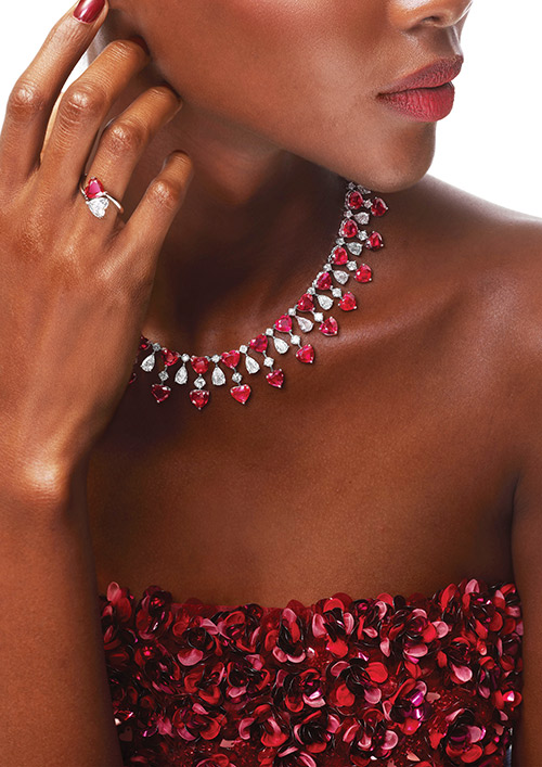 صنع العقد من الذهب الأبيض الأخلاقي عيار 18 قيراط، ويبدو تصميمه المتناغم بمثابة قصيدة شاعرية تتغنى بالضوء واللون، حيث يتداخل 64 حجر ياقوت بقطع القلب، يبلغ إجمالي وزنها 110 قراريط، مع الألماس بنسق دقيق يشبه الدانتيل ليشكّل عقداً يلتف حول العنق ويحيطه بلمسة نفيسة وخيالية في رقتها وجمالها. وقد تم اختيار كل حجر كريم بعناية ودقة متناهية انطلاقاً من اللون الأحمر الناري للياقوت إلى النقاء الكريستالي للألماس، ثم عهد به إلى أيدي خبراء صياغة المجوهرات لترصيعه في هذه التحفة الخالدة.