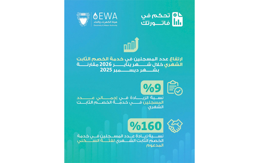 أكّد أحمد الجامع مدير إدارة خدمات المشتركين بهيئة الكهرباء والماء تزايد الإقبال على التسجيل في خدمة الخصم الثابت الشهري، مشيرًا إلى أن إجمالي عدد الحسابات المسجّلة في الخدمة ارتفع بنسبة %9 خلال شهر يناير 2026 مقارنة بشهر ديسمبر 2025.