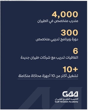 أعلنت أكاديمية الخليج للطيران عن تحقيق أداء قوي خلال عام 2025، مما يرسّخ مكانتها كمركز تدريبي إقليمي رائد، فعلى مدار العام. قامت الأكاديمية بتدريب أكثر من 4,000 متخصص في قطاع الطيران من مختلف دول العالم، مسجلةً نموًا ملحوظًا في هذا الجانب بلغت نسبته 15% مقارنةً بالعام السابق، لا سيّما بما تمتلكه من أجهزة المحاكاة والبنية التحتيّة التقنيّة، مما يعكس الطلب المتزايد على برامج التدريب المتخصص عالية الجودة في مجال الطيران.