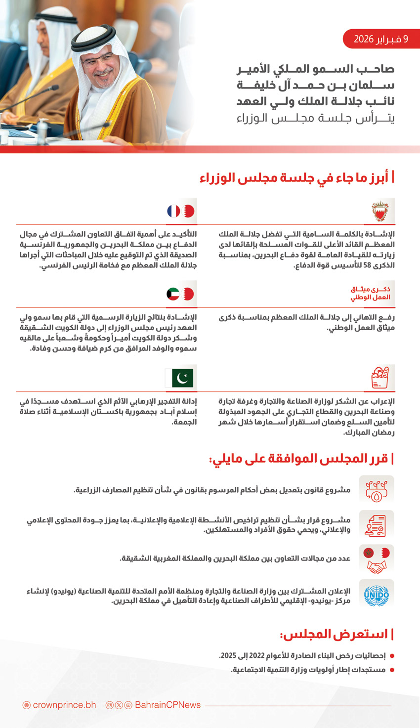 ترأس صاحب السمو الملكي الأمير سلمان بن حمد آل خليفة نائب جلالة الملك ولي العهد الاجتماع الاعتيادي الأسبوعي لمجلس الوزراء الذي عقد أمس بقصر القضيبية.