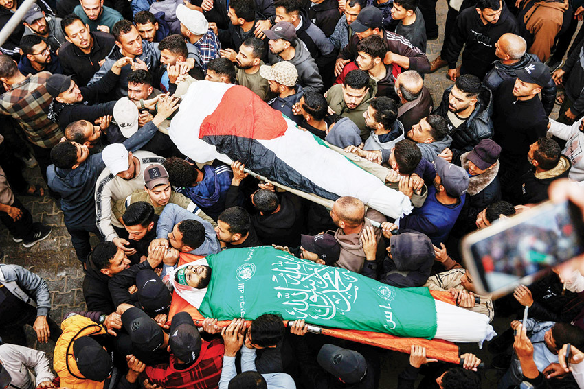 وفي مدينة غزة، تجمع عشرات الفلسطينيين لتشييع ثلاثة أشخاص استشهدوا في غارة جوية إسرائيلية على مبنى سكني بالمنطقة مساء الإثنين.