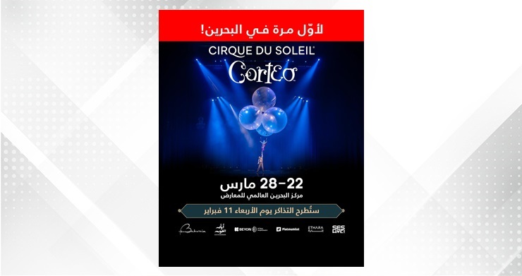 أعلنت هيئة البحرين للسياحة والمعارض عن بدء طرح تذاكر العرض العالمي الشهير "كورتيو" (Corteo) من إنتاج سيرك دو سوليه وذلك اليوم، الأربعاء، عند الساعة الخامسة مساءً، والذي تستضيفه مملكة البحرين للمرة الأولى، وذلك خلال موسم عيد الفطر المبارك، حيث يقام في مركز البحرين العالمي للمعارض خلال الفترة من 22 إلى 28 مارس 2026، ليقدّم للجمهور تجربة فنية عالمية تمزج بين الإبداع المسرحي والعروض البهلوانية والموسيقى التصويرية المبهرة.