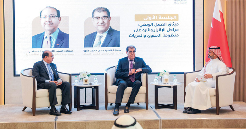 وتضمنت الجلسة الحوارية مناقشة 3 محاور رئيسية، أولها بعنوان «ميثاق العمل الوطني: مراحل الإقرار وآثاره على منظومة الحقوق والحريات»، تحدث فيها جمال فخرو النائب الأول لرئيس مجلس الشورى، وخالد المسقطي رئيس لجنة الشؤون المالية والاقتصادية بالمجلس، حيث جرى استعراض مبادئ الميثاق باعتباره المنطلق للمسار الإصلاحي الدستوري والسياسي في العهد الزاهر لجلالة الملك المعظم، وتسليط الضوء على ترسيخ منظومة الحقوق والحريات، وانعكاس مبادئ الميثاق على الدستور والتشريعات الوطنية.