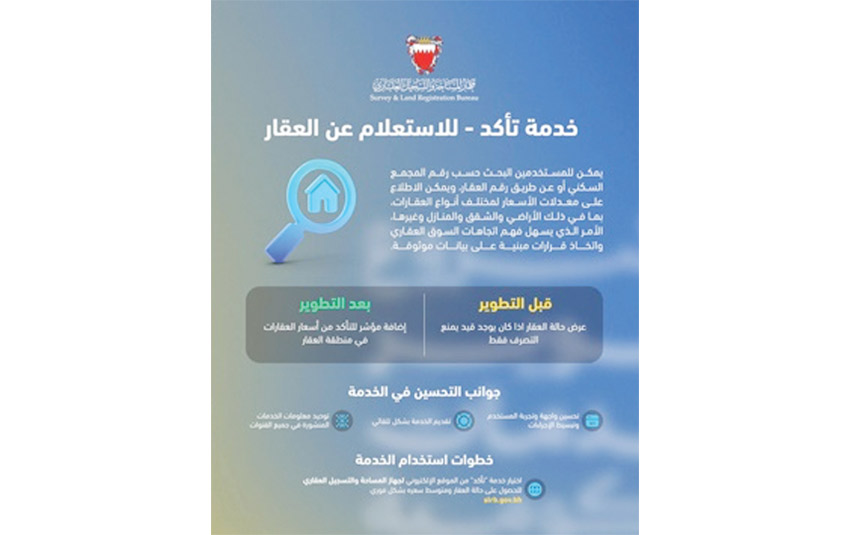 وأضاف أن خدمة «تأكد» حققت إنجازًا مهما بحصولها على المركز الأول في جائزة البحرين للمحتوى الرقمي 2025 ضمن فئة المستوطنات الذكية والتوسع العمراني في شهر يوليو 2025، ما يعكس جودة الخدمة وأثرها الإيجابي في تطوير منظومة الخدمات الرقمية، لافتًا إلى أن إطلاق خدمة «تأكد» بنسختها الثانية يأتي ضمن تبنّي حلول رقمية مبتكرة تسهم في توسيع نطاق البيانات المقدمة للمستفيدين، وتحسين سهولة الوصول إلى المعلومات العقارية، بما يدعم كفاءة الإجراءات، ويرفع مستوى الشفافية في السوق العقاري.