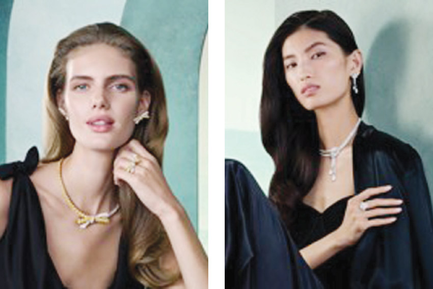وفي تصاميم أخرى، تتجلّى العُقدة بحضور نَحتي متجدّد، حيث تُصاغ القلادة والأقراط في عُقدة جريئة ومعقّدة، تنساب أطرافها المنحنية والمتدفّقة مرصّعة بألماسات كمثرية الشكل، وتُستكمل بخاتم سوليتير مرصّع بألماسة كمثرية الشكلتزن 10 قراريط. وفي طرحٍ مغاير أكثر نعومة، يقدّم تصميم آخر رؤية رقيقة، تتشكّل فيها أشرطة دقيقة من الذهب الأبيض في عقد مزدوجة الحلقات، مرصّعة بألماسات بقطع باغيت ودائرية.
