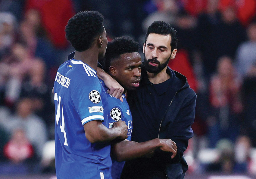 مدريد - (د ب أ): طالب ألفارو أربيلوا، المدير الفني لفريق ريال مدريد الإسباني، اللاعب الأرجنتيني جيانلوكا بريستياني، جناح فريق بنفيكا البرتغالي، بالكشف عما قاله للبرازيلي فينيسيوس جونيور، خلال لقاء الفريقين ببطولة دوري أبطال أوروبا لكرة القدم.