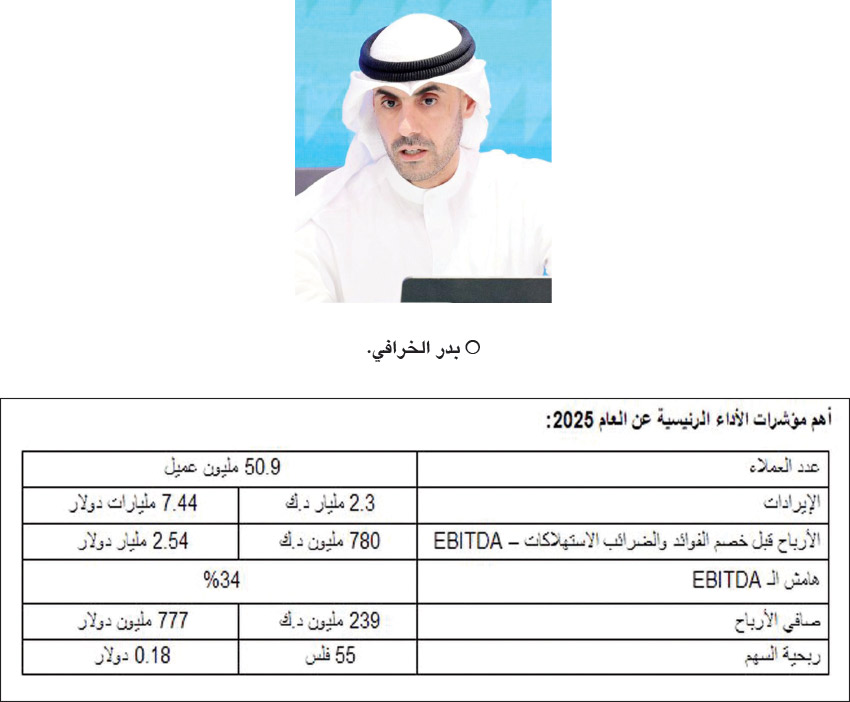 وأضاف الخرافي قائلا: «جاءت النتائج المالية القوية مدفوعة بالتطبيق السليم للنهج الاستثماري المسؤول بالتركيز على تطوير وتوسعة الشبكات - في تقنيات الجيل الخامس والجيل الرابع وتسريع نشر الألياف الضوئية - إلى جانب التأكد من الإدارة الرشيدة للإنفاق الرأسمالي والتشغيلي الموجه لتعزيز البنية التحتية الرقمية، حيث بلغت قيمة الاستثمارات خلال العام الماضي نحو 1.5 مليار دولار (بارتفاع 40% - وهي تمثل 20% من إجمالي الإيرادات).